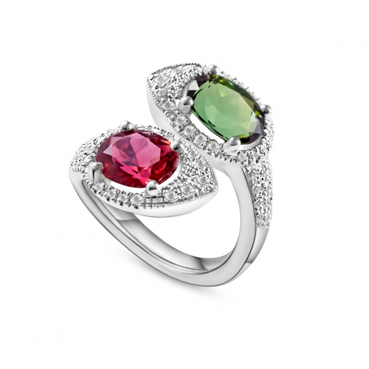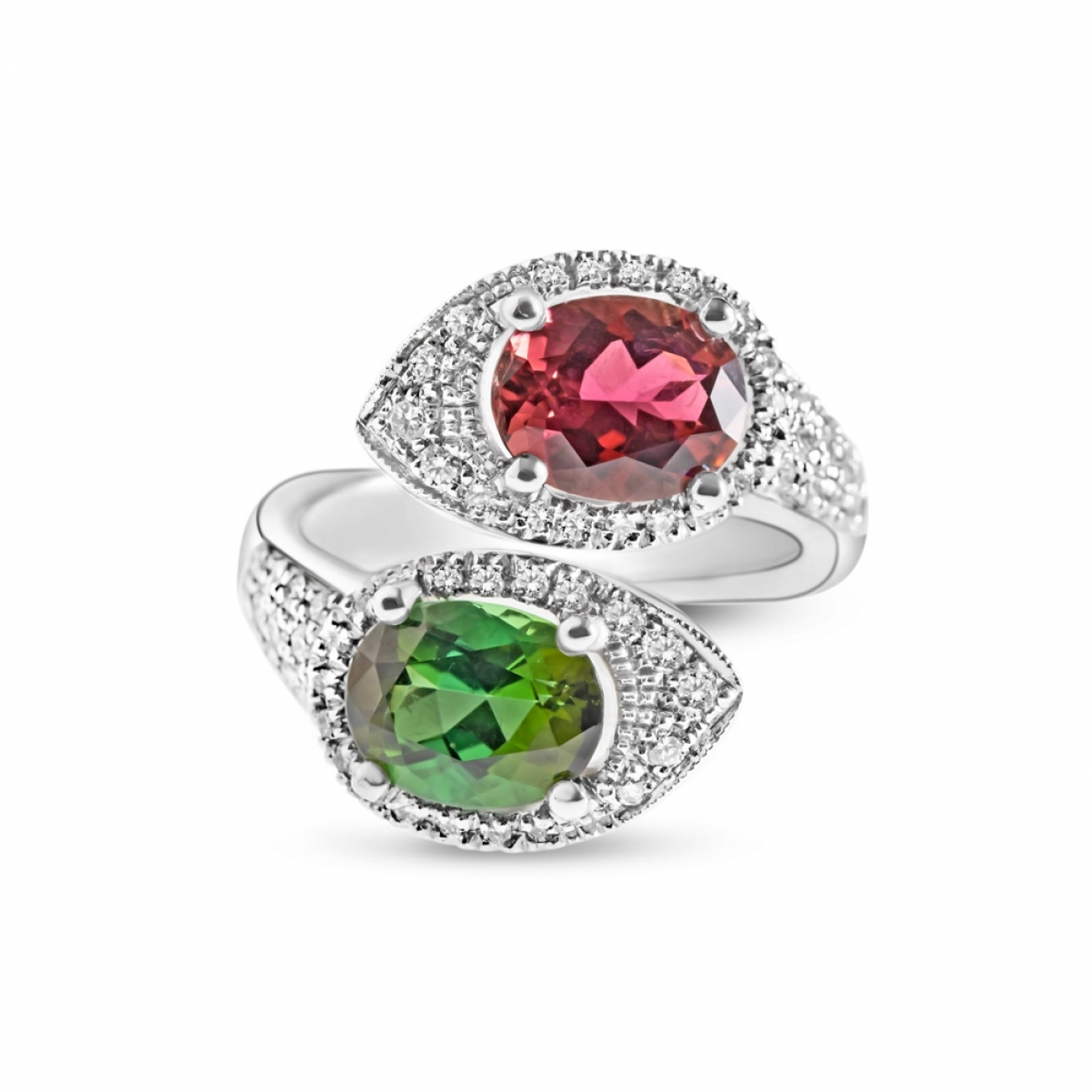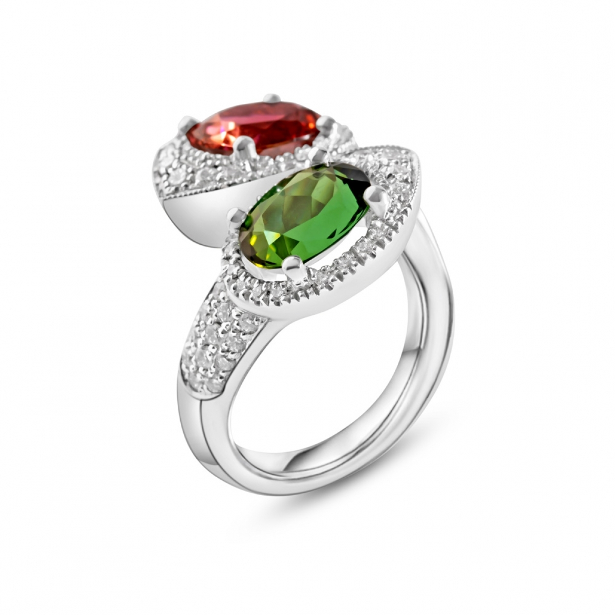 Questo anello in stile contrarié, che monta due preziose gemme di colore stupefacente, rosso rosato (Tormalina Rubellite) e verde (Tormalina Verdelite) rappresenta in modo perfetto due diversi caratteri ma in una sola anima comune. Le pietre sembrano cercarsi e rincorrersi in un movimento continuo. Il pavé di diamanti impreziosisce ancor più questo esempio di alta gioielleria. Dettagli prodotto