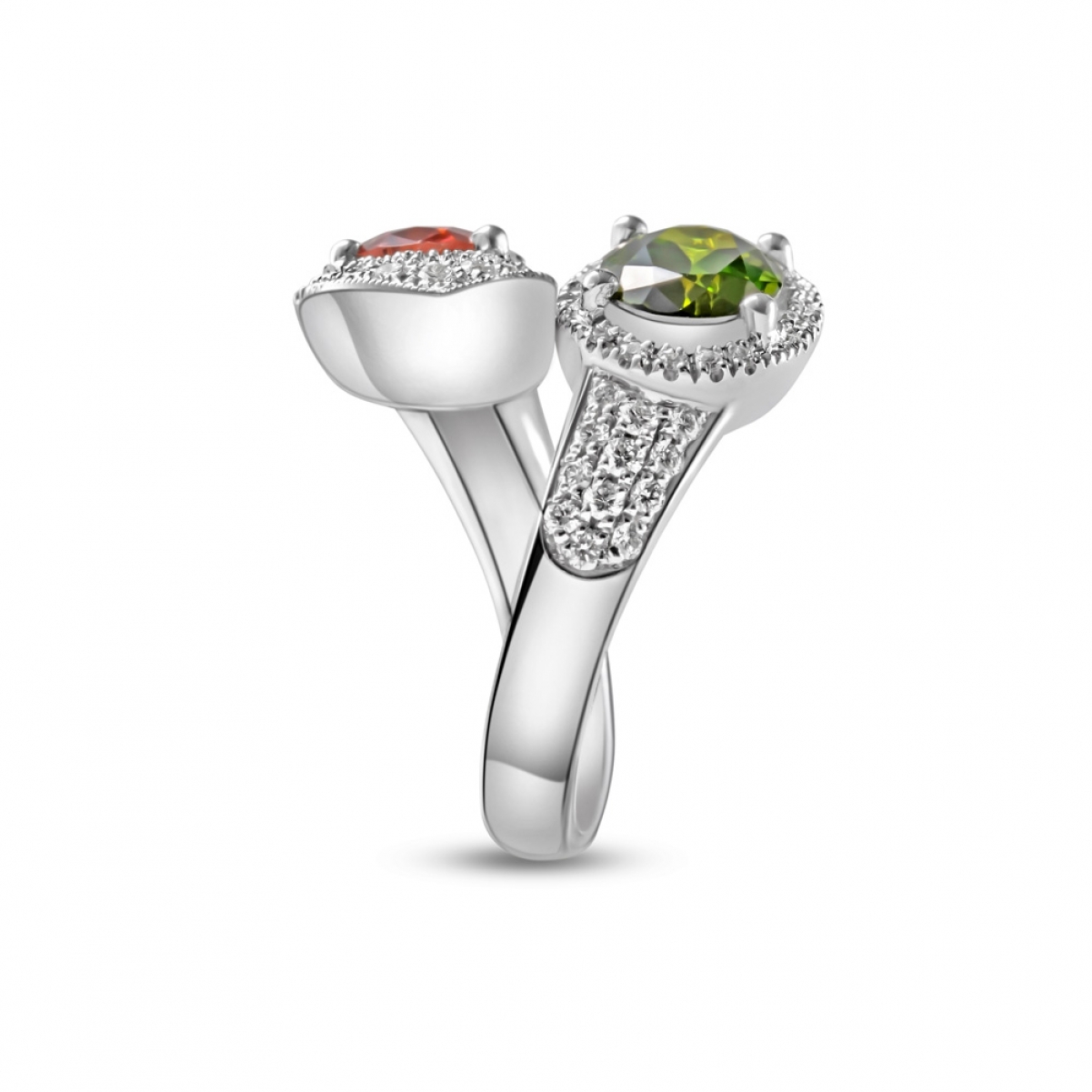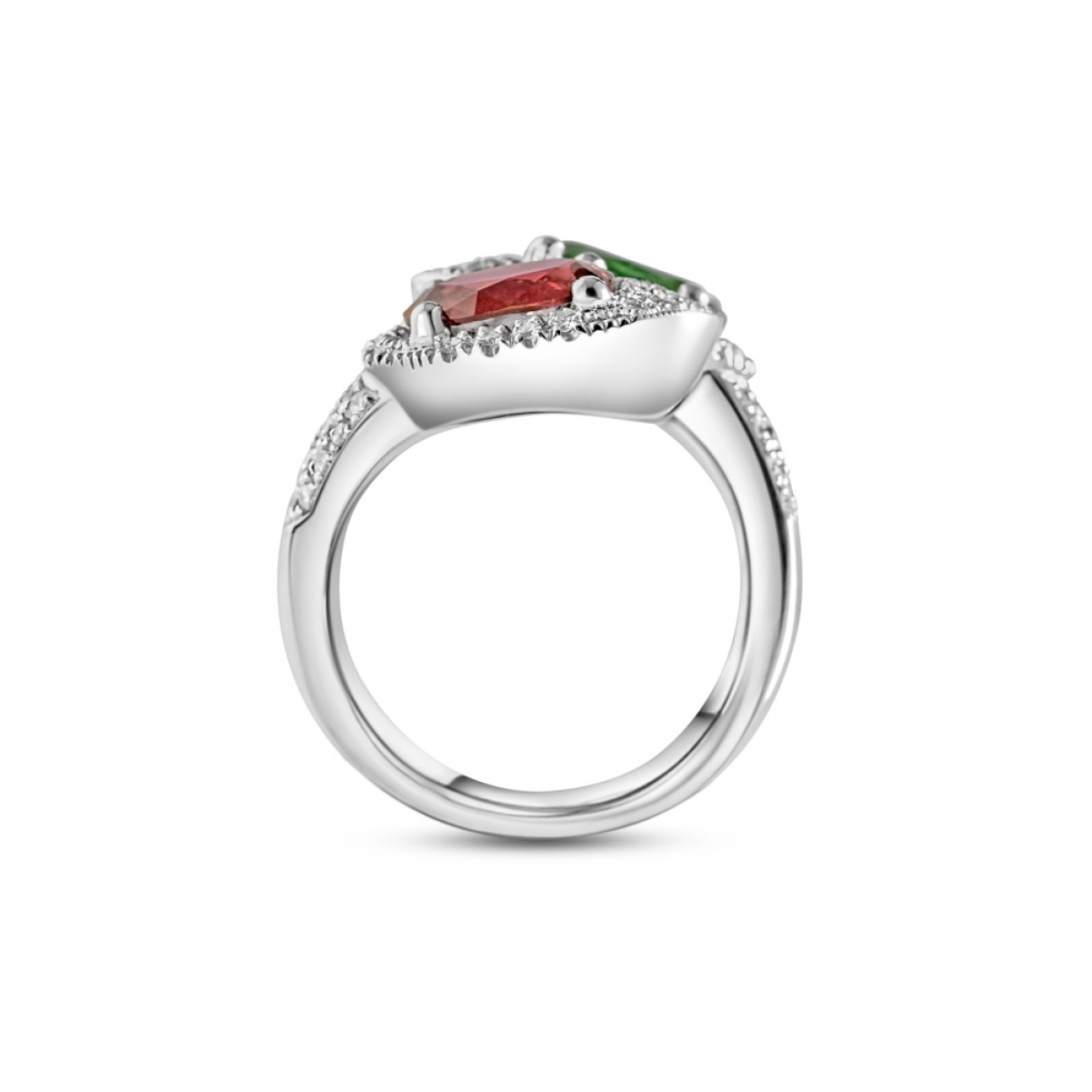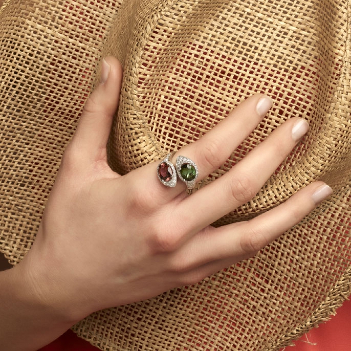 Questo anello in stile contrarié, che monta due preziose gemme di colore stupefacente, rosso rosato (Tormalina Rubellite) e verde (Tormalina Verdelite) rappresenta in modo perfetto due diversi caratteri ma in una sola anima comune. Le pietre sembrano cercarsi e rincorrersi in un movimento continuo. Il pavé di diamanti impreziosisce ancor più questo esempio di alta gioielleria. Dettagli prodotto