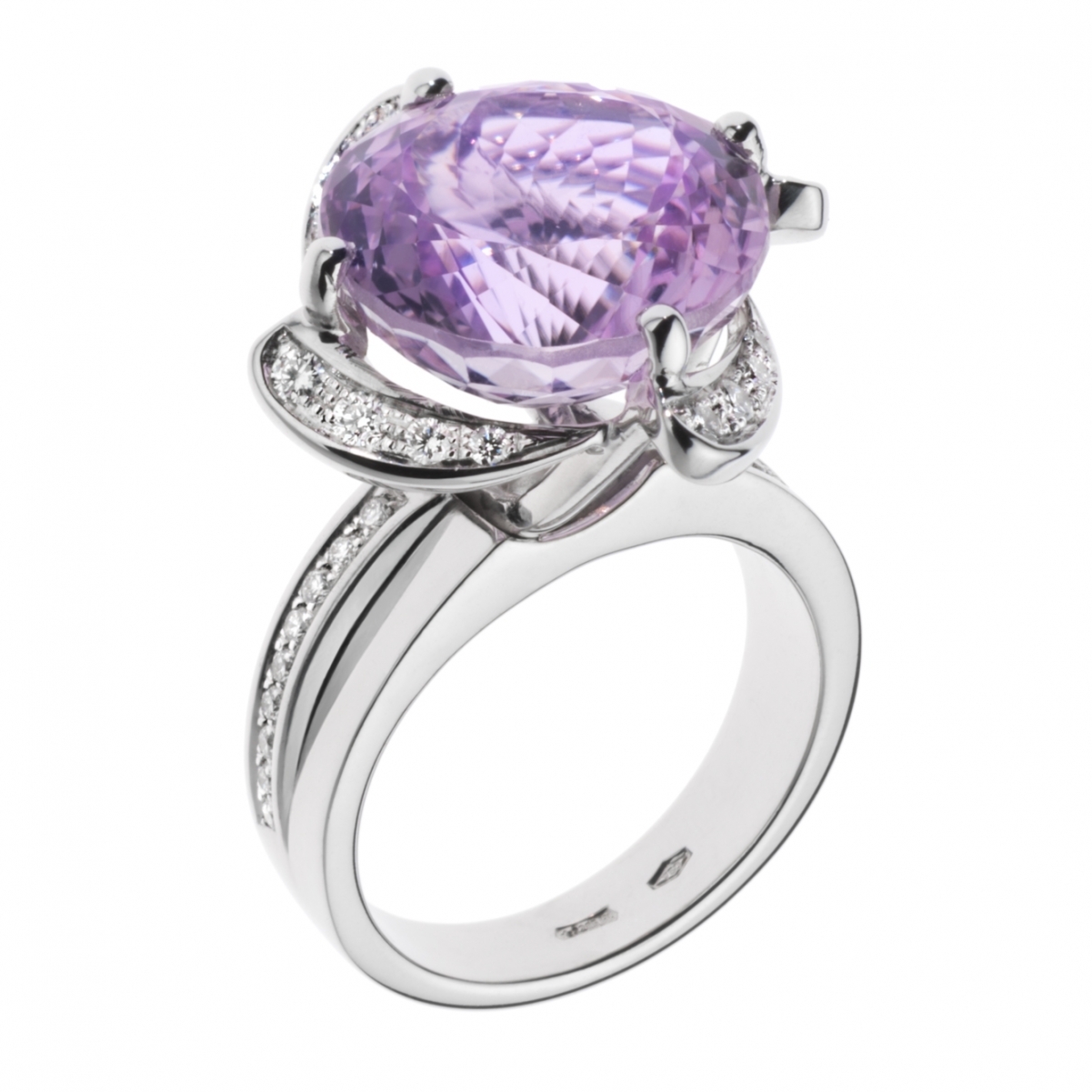 Una gemma luminosissima e brillante di un affascinante rosa, viene esaltata da un contorno di diamanti naturali di altissima qualità.Un anello che celebra il colore nella espressione migliore.