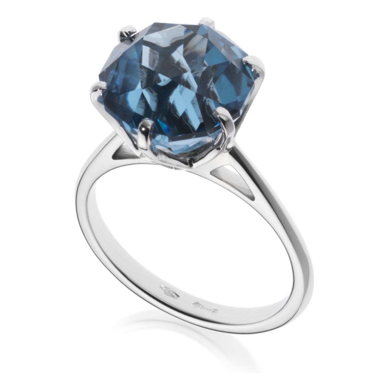 L’anello Cairo porta una meravigliosa gemma di Topazio Blu London di circa 10 carati tagliata come un antico e famoso diamante (Cairo Star Cut).