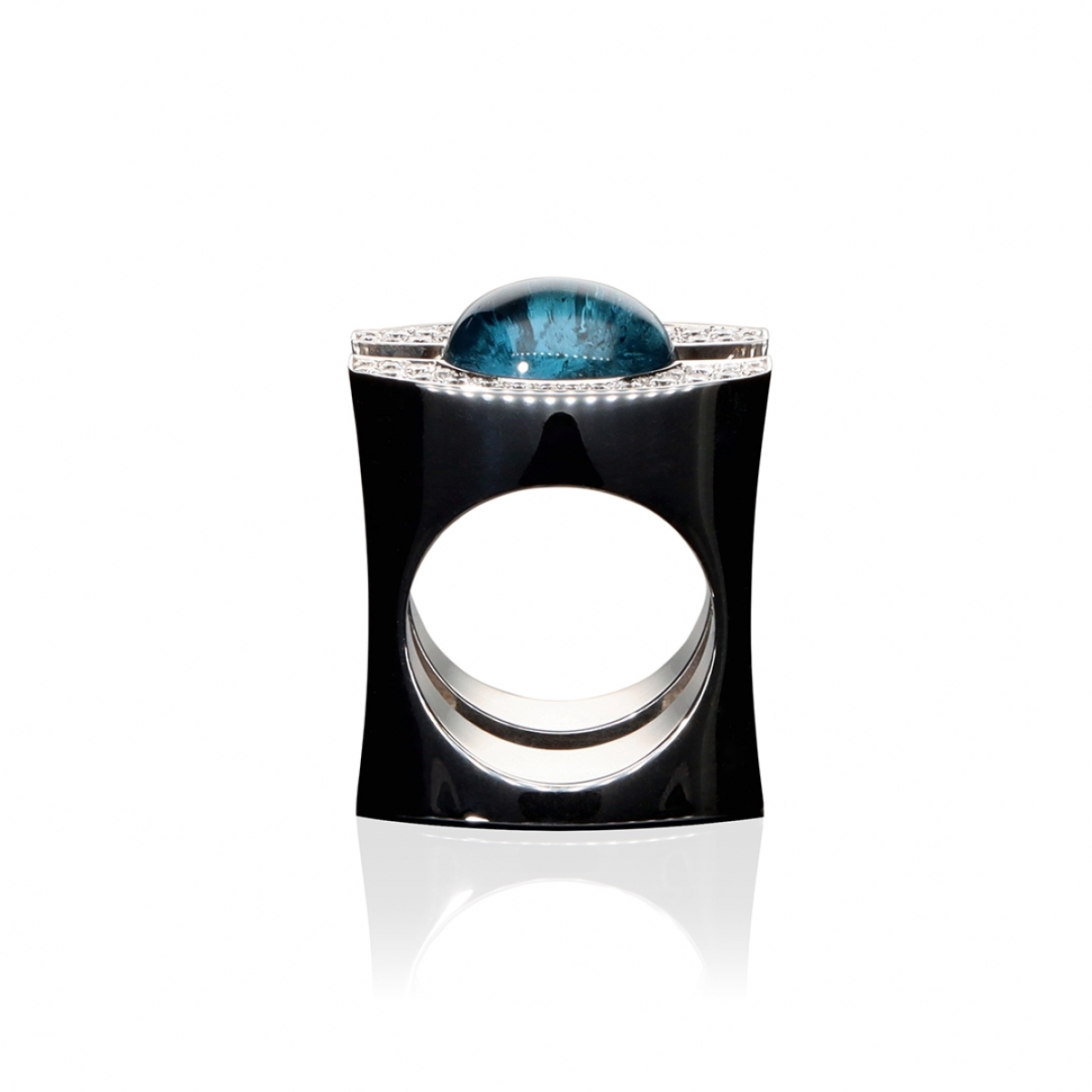 Anello in oro bianco e diamanti. La gemma centrale è un raro cabochon di Tormalina indicolite con effetto “cat’s eye”, la cui particolarità è la creazione di un’affascinante linea di luce lungo la pietra illuminata, ripresa ed accentuata dal modello che presenta una profonda fenditura centrale, quasi a spaccare l’anello a metà con la sua forza. Le linee al contempo morbide e rigorose, sono enfatizzate dalla lucidatura a specchio del metallo.