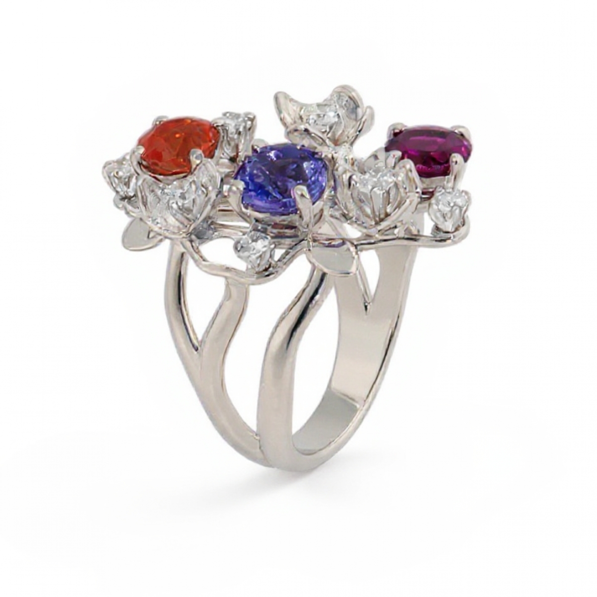 Le pietre sono abbinate per colori complementari che si esaltano reciprocamente. Le foglioline sono rifinite con una puntinatura che enfatizza il gioco lucido/satinato permettendo ai diamanti di evidenziare in modo splendido la propria brillantezza.