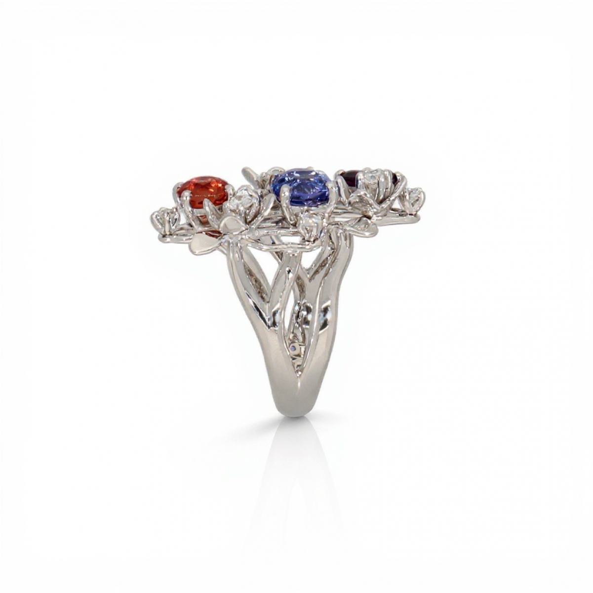 Questo anello è un pezzo unico, costruito e rifinito a mano da un artigiano orafo italiano di grande talento, con linee sinuose che riprendono fedelmente i ramoscelli e le foglie di una pianta, a rappresentare un giardino fiorito.