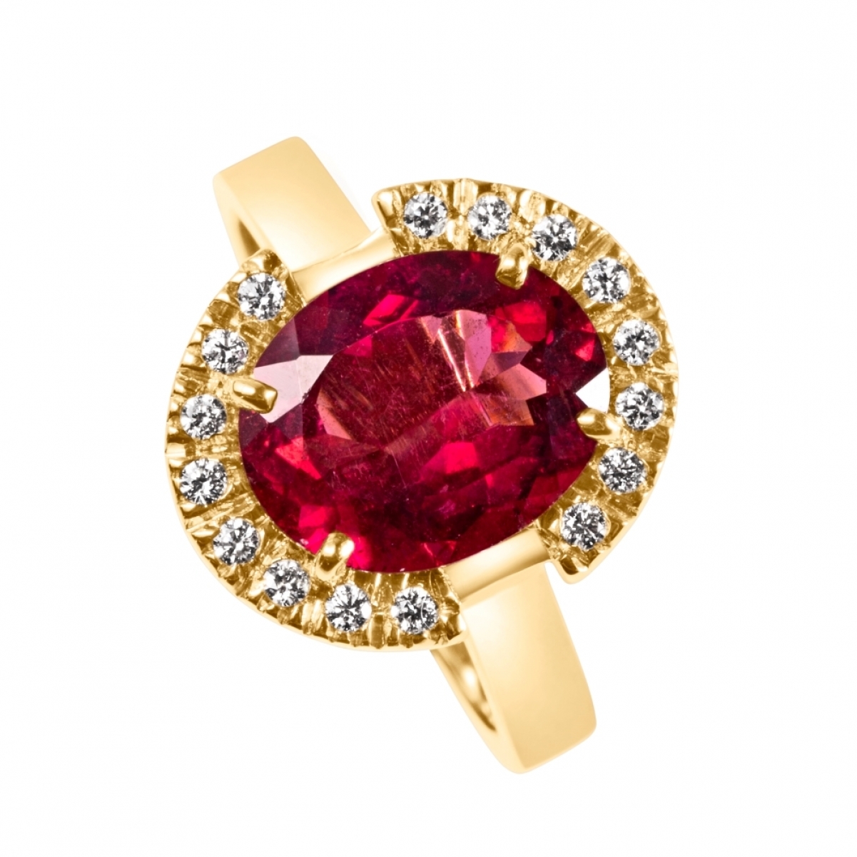 La magnifica gemma di Tormalina rossa, avvolta in un abbraccio di scintillanti diamanti, brilla con un fuoco interno che cattura lo sguardo e il cuore.