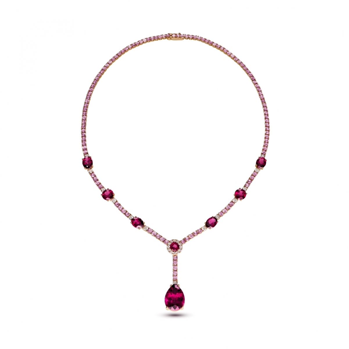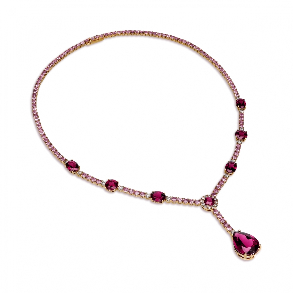 A impreziosire il disegno, si alternano gemme di rodolite dal fascino profondo, che vibrano di tonalità amaranto, sfumando dal rosso al violaceo, fino a raggiungere il porpora più intenso — come il riflesso di un vino pregiato in un calice d’autore.