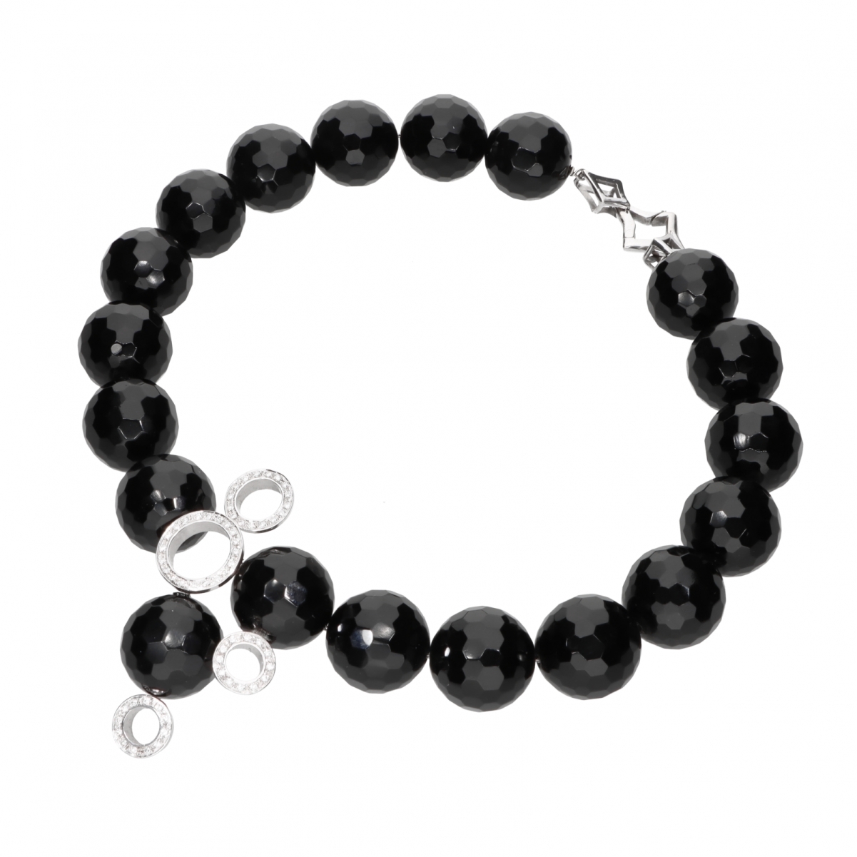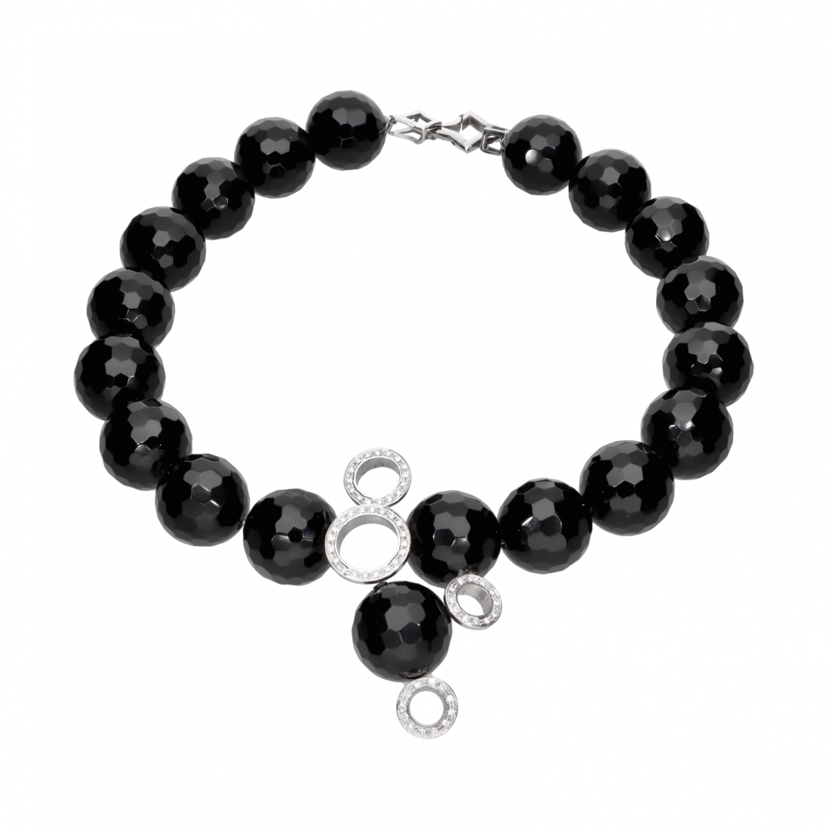 In un gioco prezioso di riflessi di luce, i cerchi in oro bianco e diamanti stanno fra le boules di Onice nera briolettate, con faccette luminose e scintillanti a ogni respiro, adornano il collo di una donna sicura di sé e della sua bellezza.