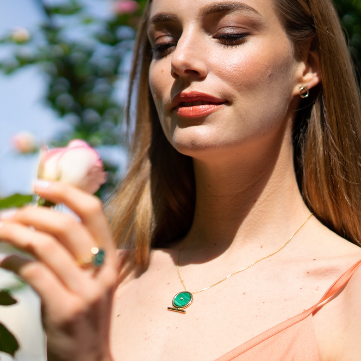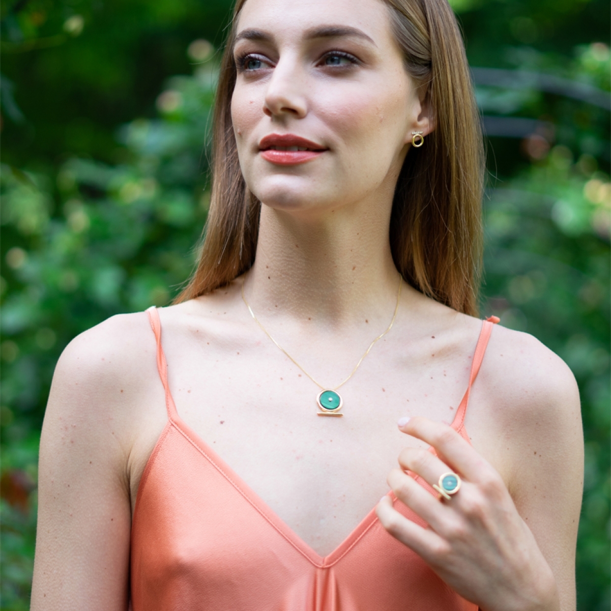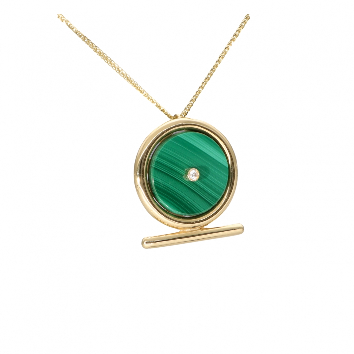 Il pendente Shen Ra associa alla forma del simbolo egizio dell'eterno fluire del tempo, una pietra che con il suo colore verde brillante ricollega al potere della natura. Il punto luce centrale rappresenta il Sole e la sua Luce.