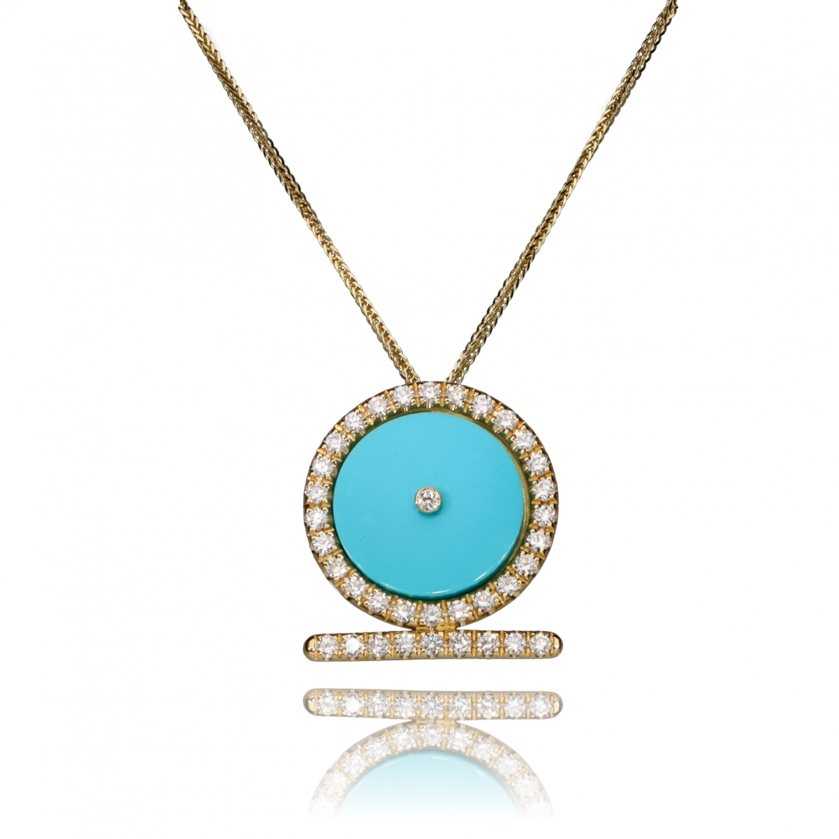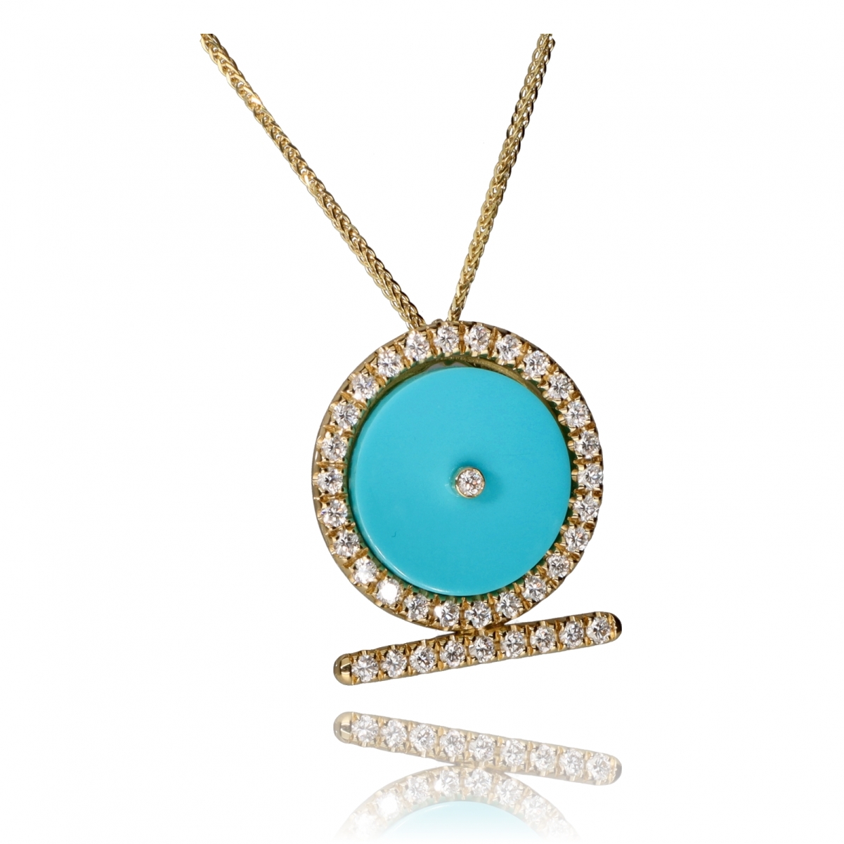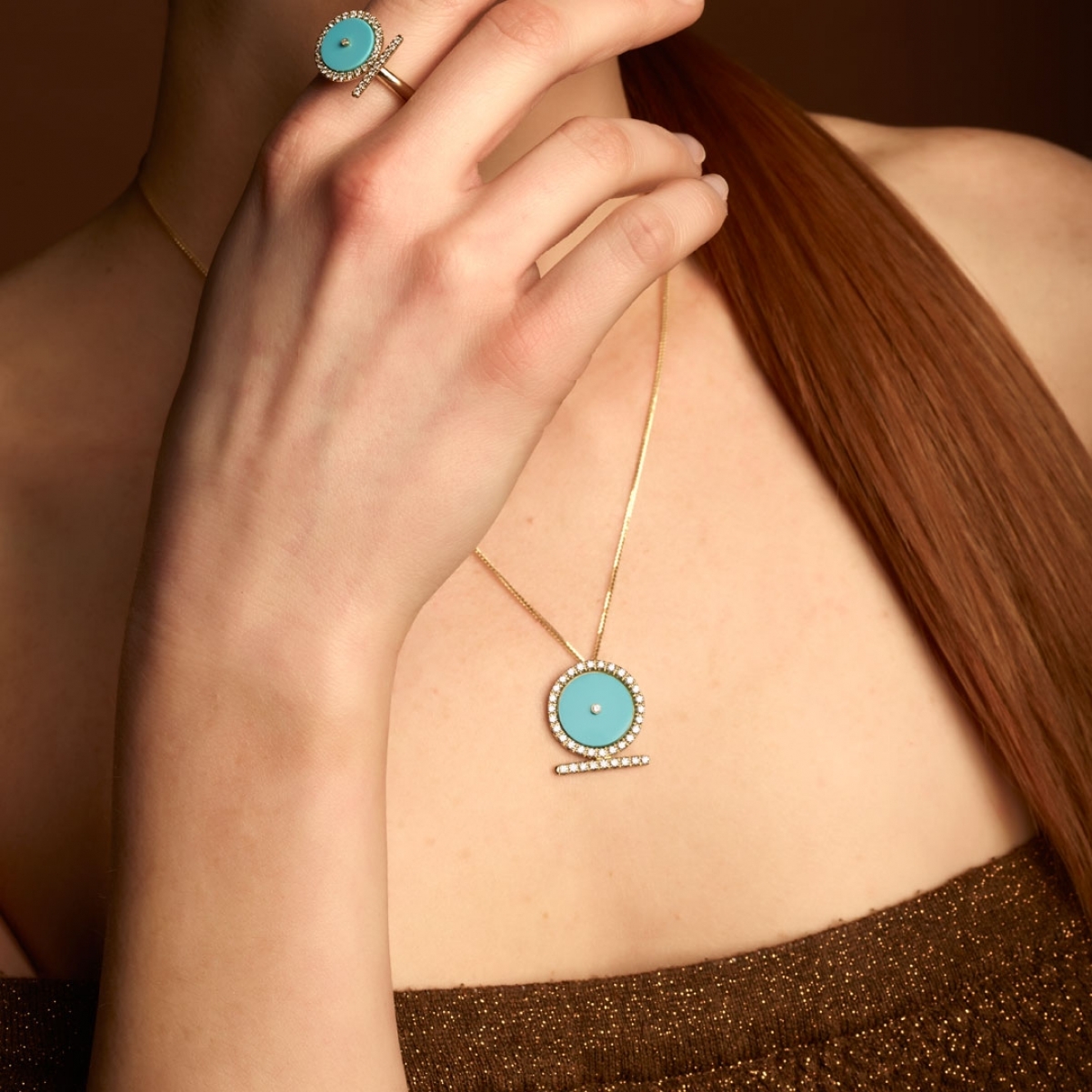 Questo prezioso pendente appartiene alla linea Shen Ra, caratterizzata dal simbolo egizio dell'eterno fluire del tempo. L'oro del sole, la brillantezza della sua luce nel cerchio di diamanti, ed il colore turchese dell'acqua del mare più splendido fanno di questo gioiello una celebrazione dell'estate.