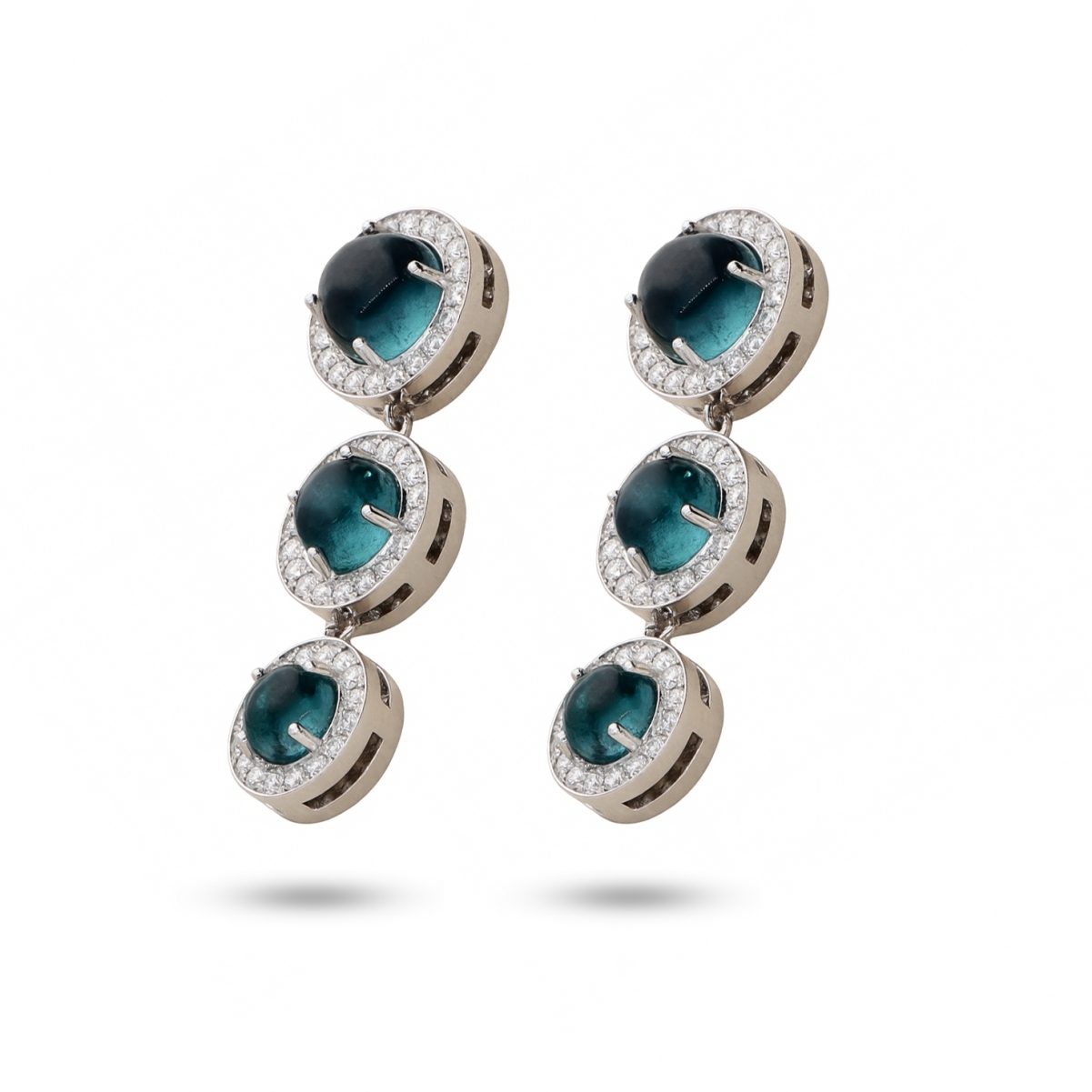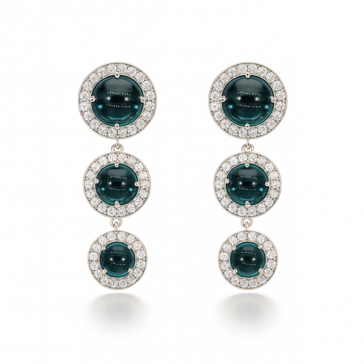 Orecchini in oro bianco, Diamanti e Tormalina Indicolite taglio cabochon.