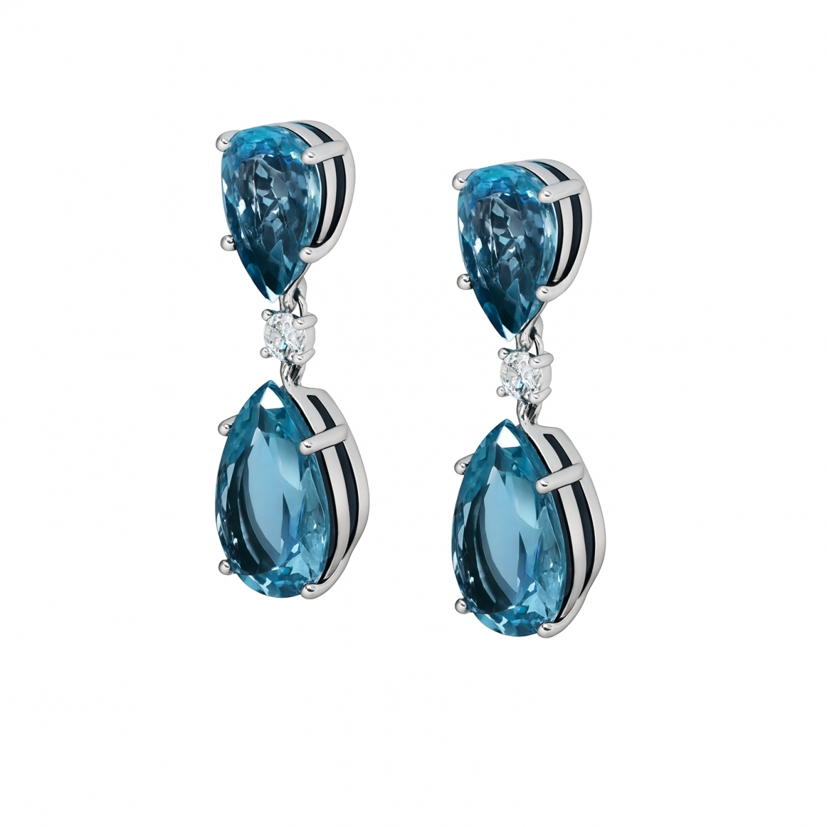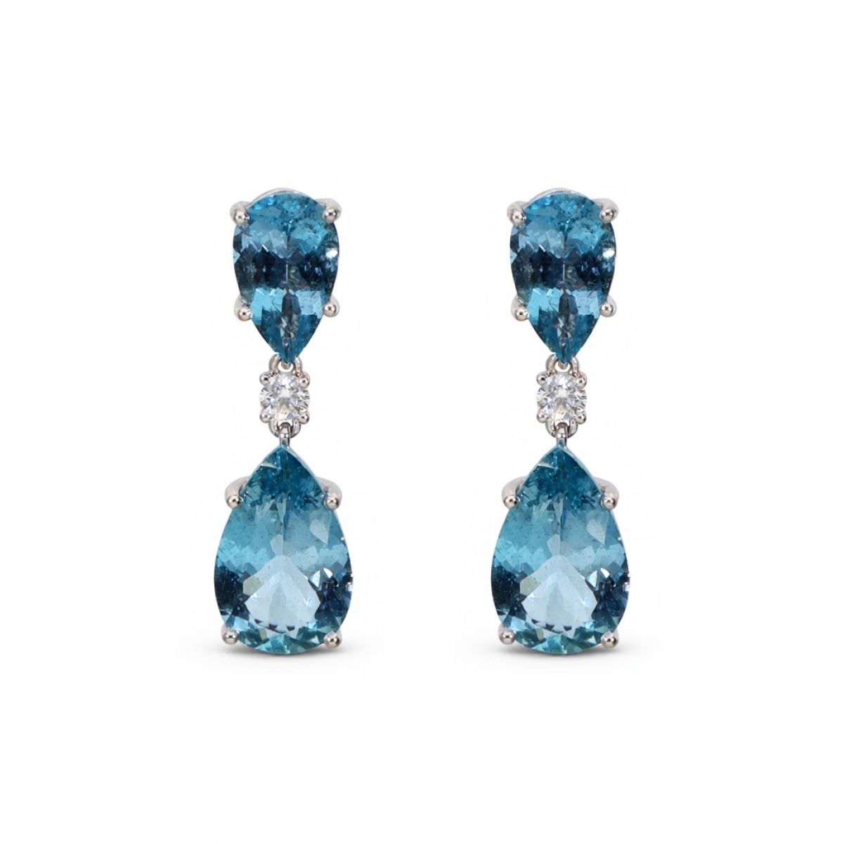 Orecchini in oro bianco, Diamanti e gocce di Acquamarina di eccezionale qualità e colore, provenienti dalla miniera brasiliana di Santa Maria de Itabira. La rarità di questo tipo di pietre, in particolare a coppie parigliate, rendono questi orecchini di particolare pregio.
