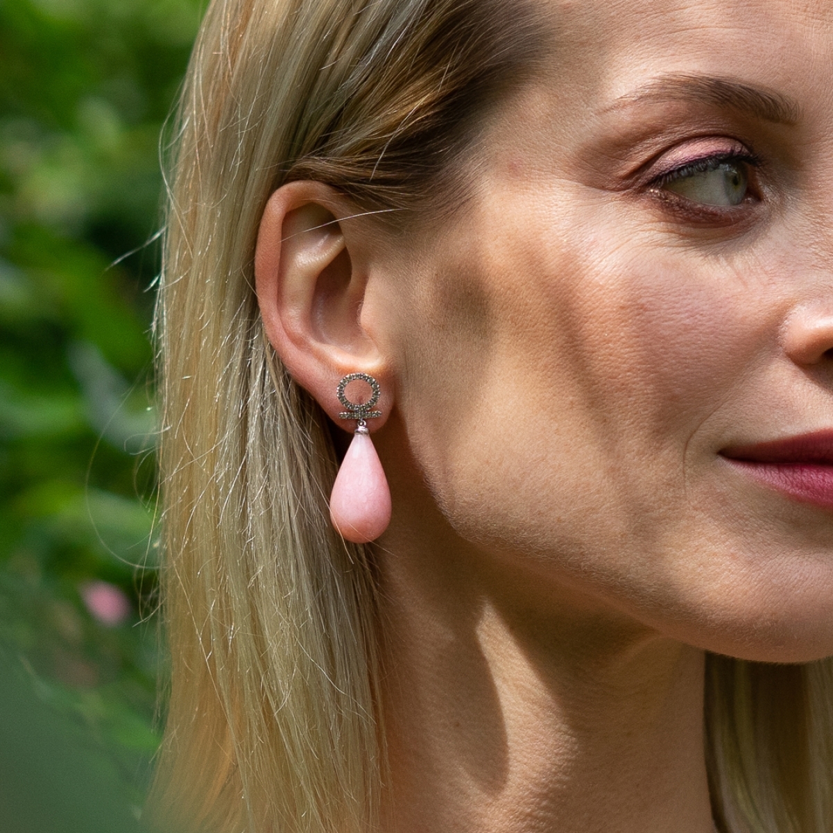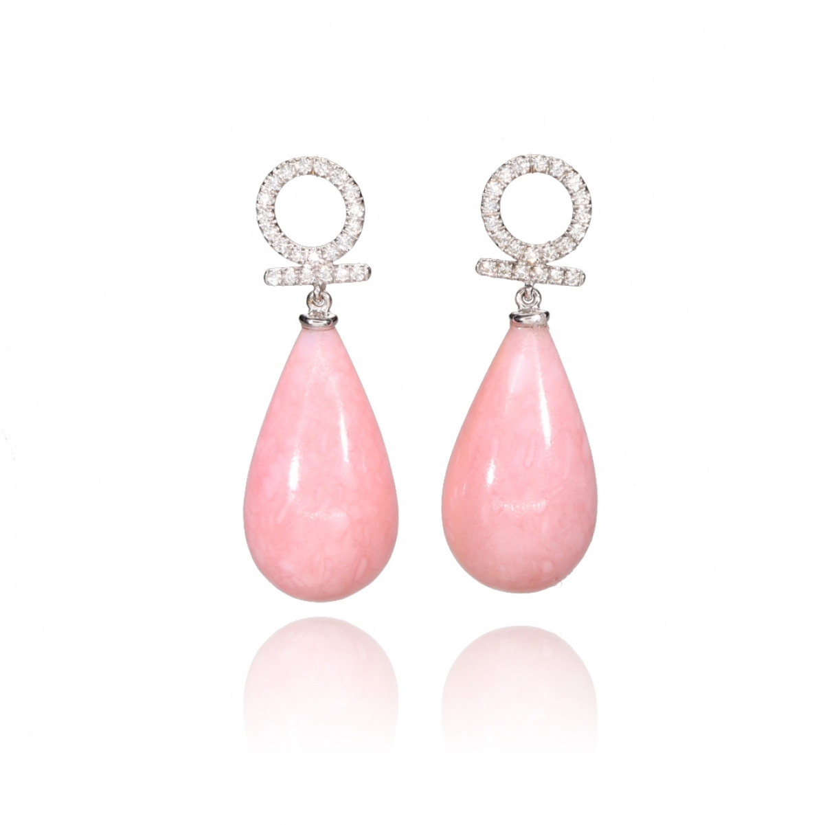 Questi preziosi orecchini con diamanti partono dallo Shen egizio, simbolo dell'eterno fluire del tempo, da cui scende fluida una goccia di Opale rosa.